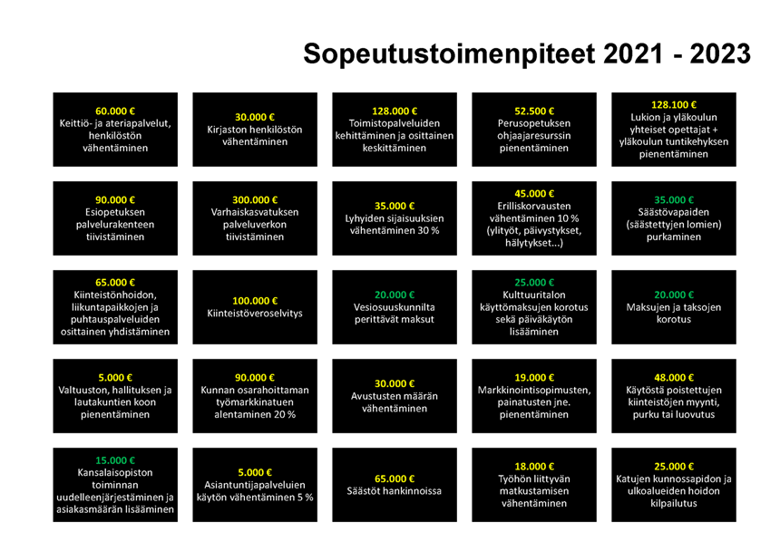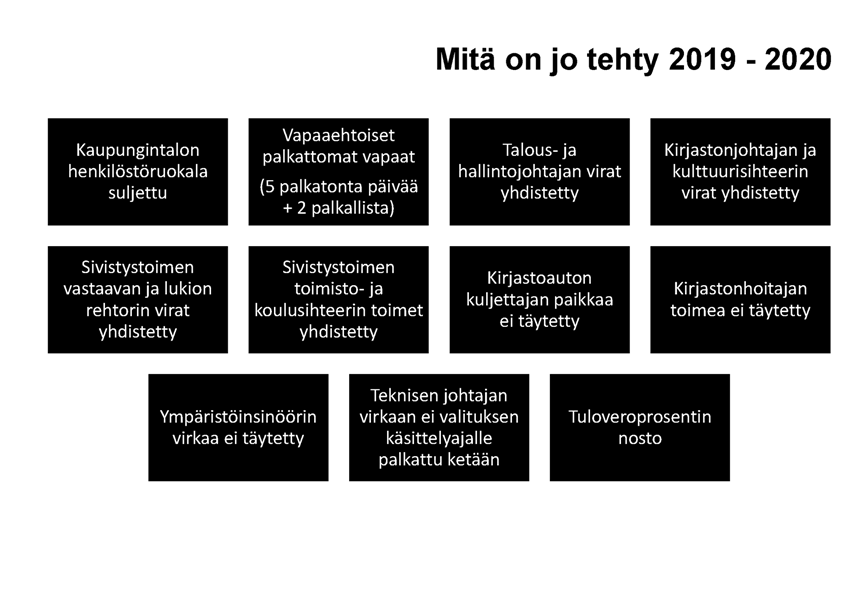 Valtuusto hyväksyi kokouksessaan 28.9.2020 talouden tasapainottamistoimenpiteet (pl. kouluverkkoa kosevat muutokset. jotka käsitellään myöhemmin). Laaja toimenpidepaketti sisältää esimerkiksi henkilöstösäästöjä, palvelurakenteen tiivistämistä ja uudelleenjärjestelyä, kiinteistöveroselvityksen, maksujen ja taksojen korotuksia, avustusten pienentämisen, työmarkkinatuen alentamisen sekä hankintasäästöt.